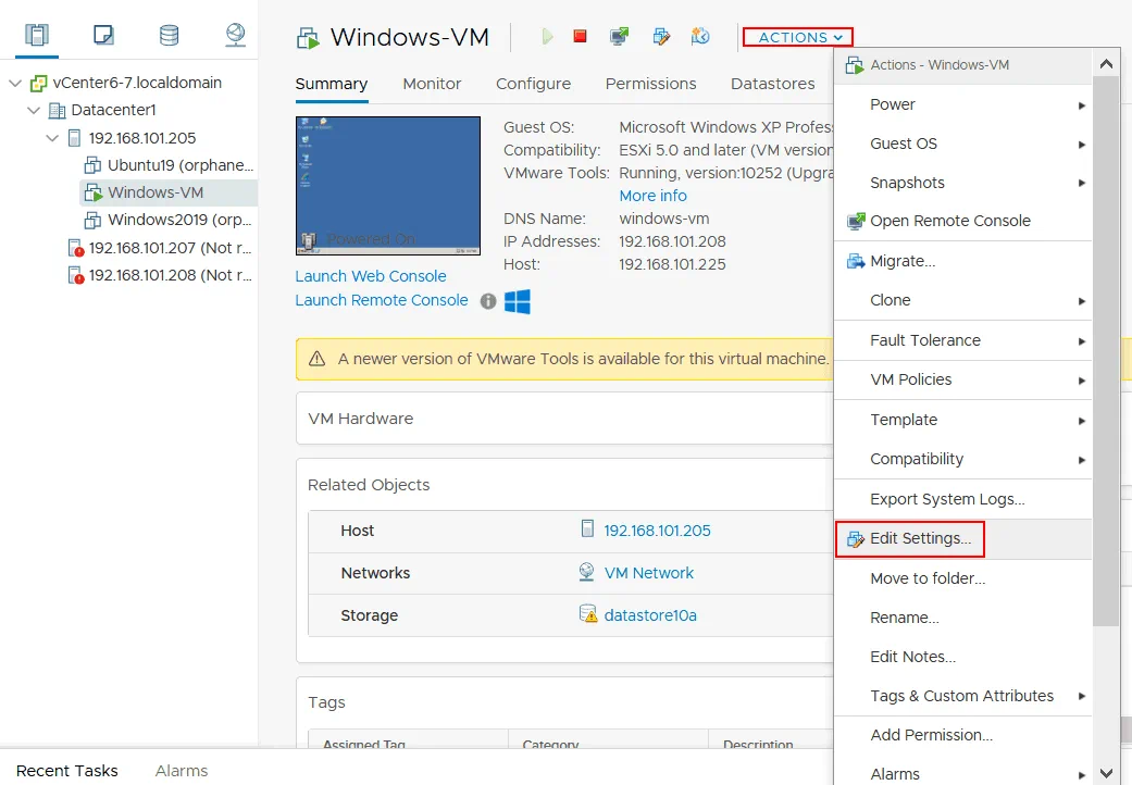 - Once you have selected the virtual machine, click Actions > Edit settings.