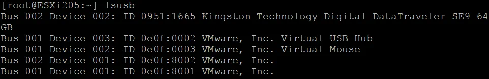 - You can then check if the USB device is connected to ESXi in the ESXi command line interface: