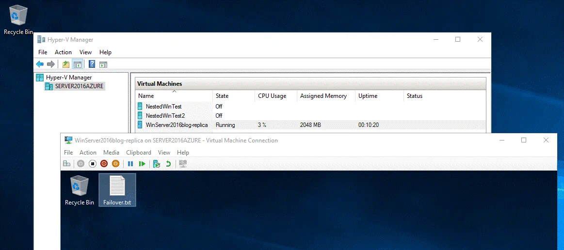 You can connect to your Azure VM running Hyper-V via RDP and see that a nested VM replica is powered on. All changes are now written to the nested VM replica.