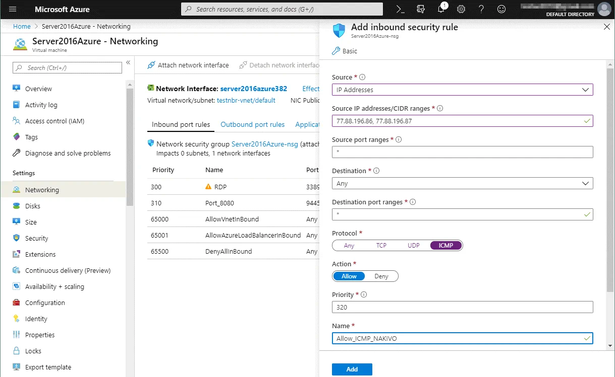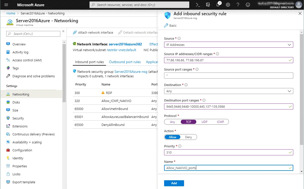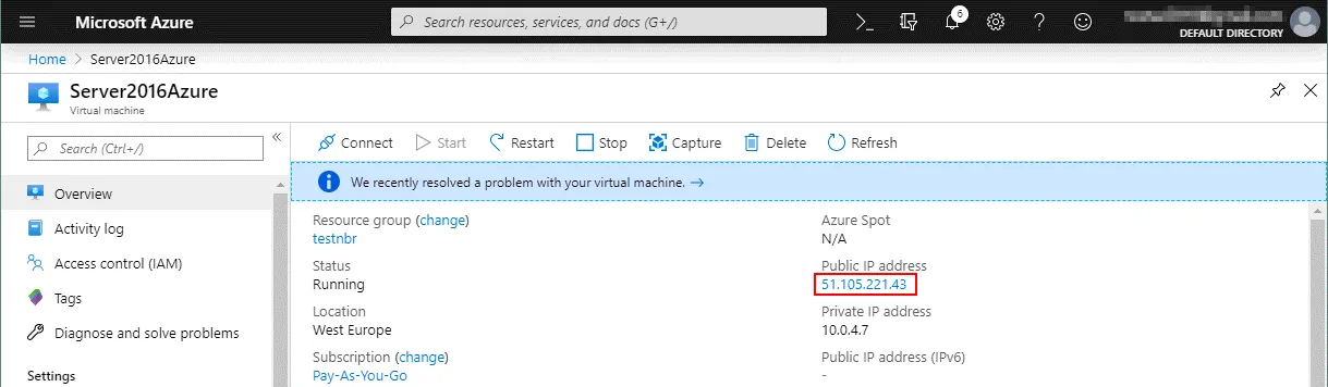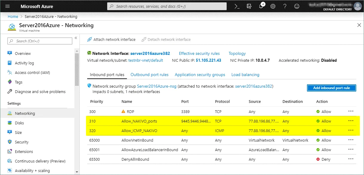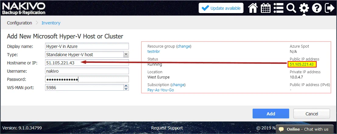 Notice, that when you add a Hyper-V host to the inventory of NAKIVO Backup & Replication, Transporter is automatically installed on that Hyper-V host. Hence, you don’t need to deploy Transporter manually on the remote Hyper-V host running in Azure. Check the external IP address of your Azure VM running Hyper-V. You can use the web interface of Azure for this purpose.