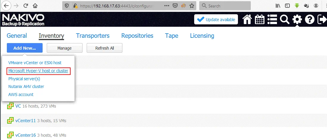 Go to Configuration > Inventory and click Add New. In the opened menu, select Microsoft Hyper-V host or cluster.