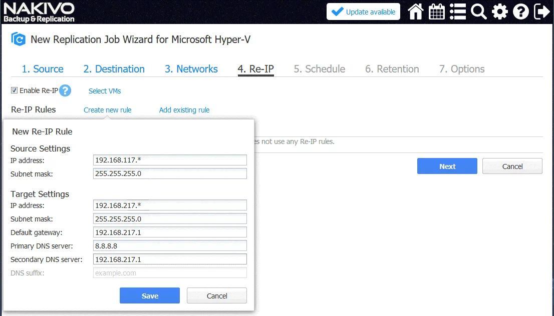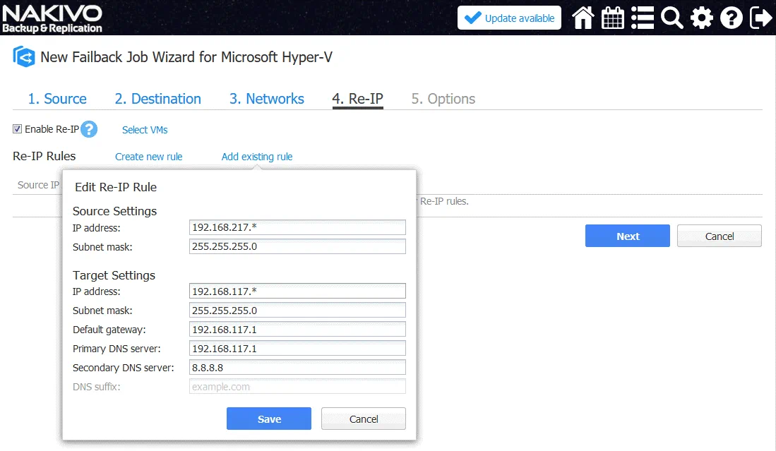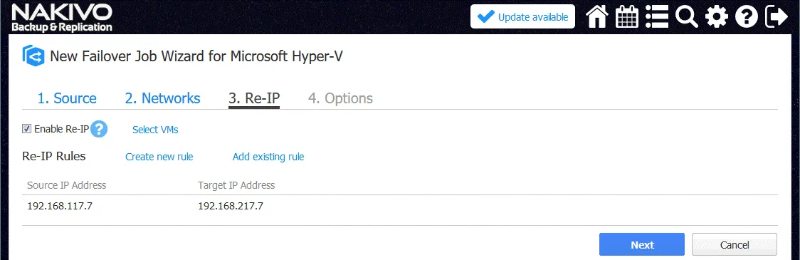4. Re-IP. After configuring Network Mapping, a VM replica will be connected to the required virtual network. Now it’s time to define the IP address that is valid for the selected network for VM replica. The Re-IP feature allows you to create a rule that can be applicable to multiple VMs and set which source IP addresses must be changed to which destination IP address.