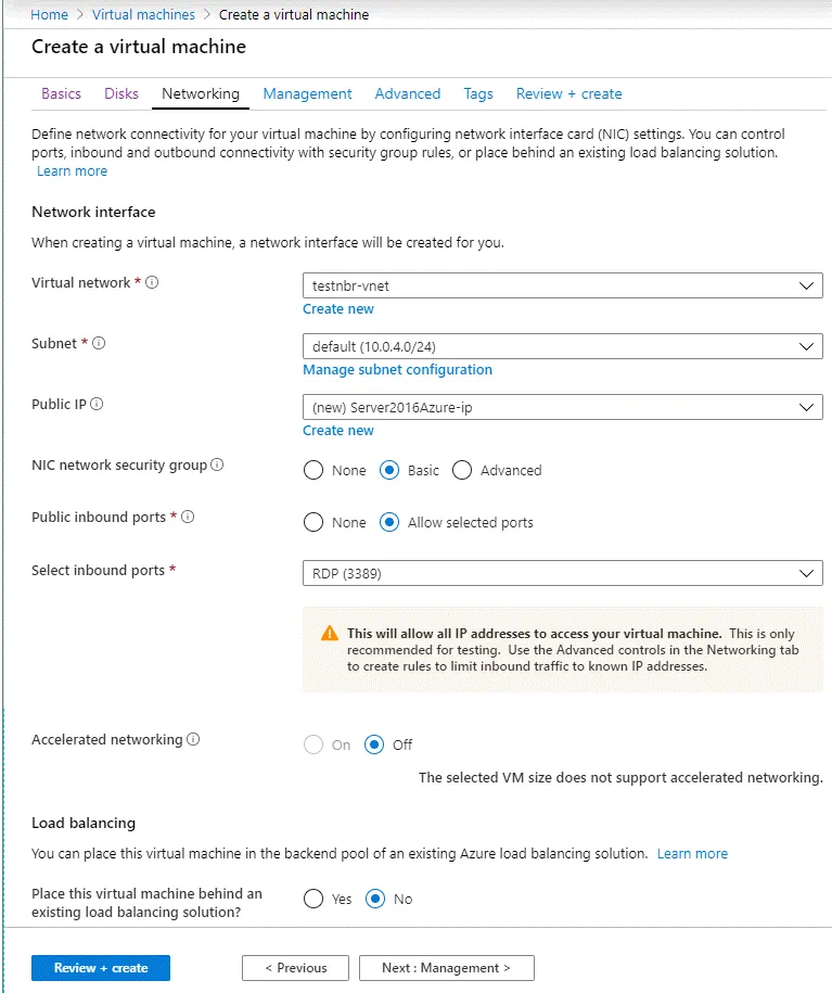 Virtual network: Select an existing virtual network or create a new one. In this example, testnbr-vnet is the name of the virtual network.