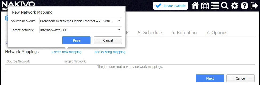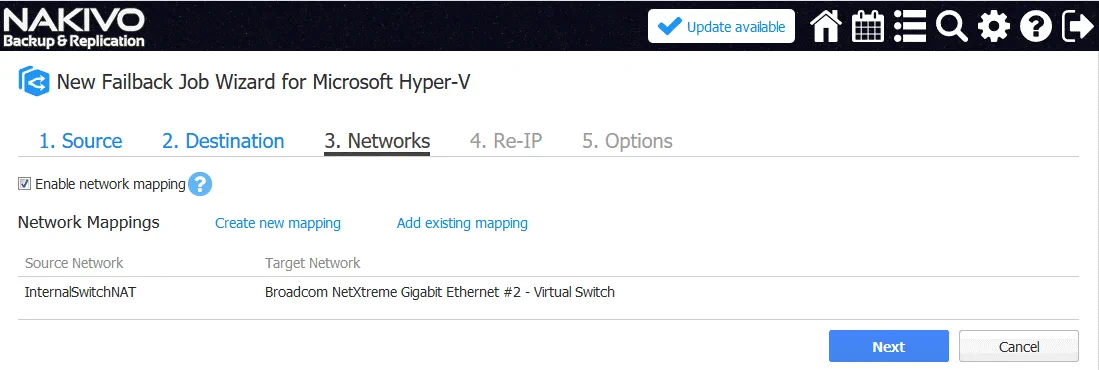 3. Networks. Create the inverse network mapping rule (in the reverse order) comparing to the previous rule when you configured a failover job. In this case, the source network is InternalSwitchNAT and the target network is Broadcom NetXtreme.