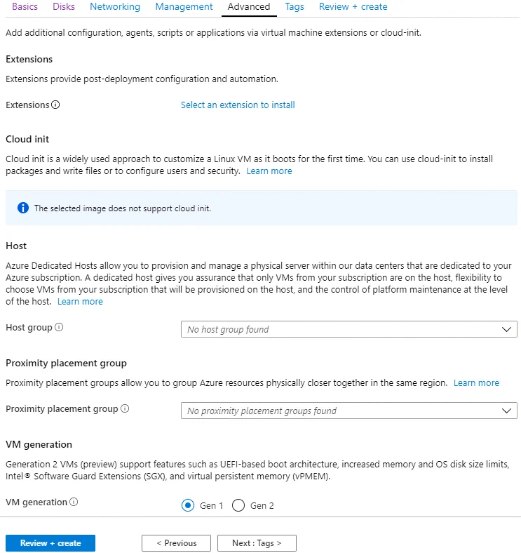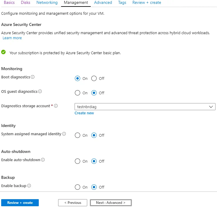 In this tab, you can configure monitoring and management options for your Azure virtual machine. You can leave the default management parameters and create a diagnostic storage account if the account has not yet been created. If you are unsure as to what options to configure in this tab, leave the default parameters.