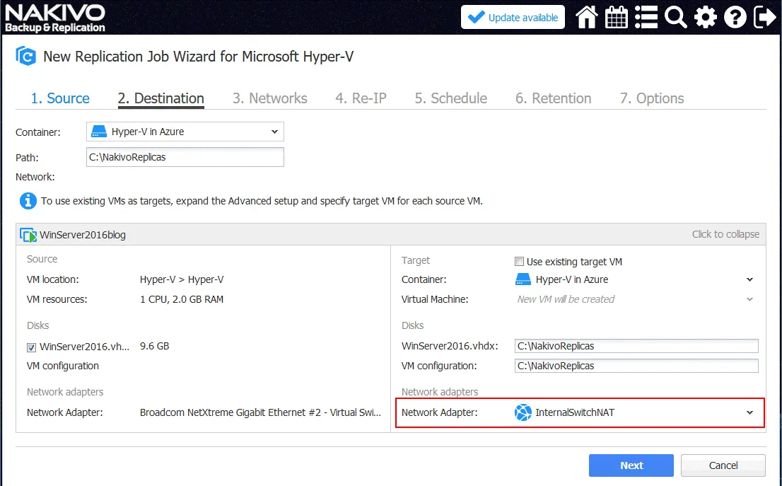Network mapping is intended to define to which virtual network (virtual switch) a virtual network adapter of a VM replica must be connected after finishing the replication job. This feature prevents you from manually configuring network settings for the VM replica on the destination Hyper-V host.