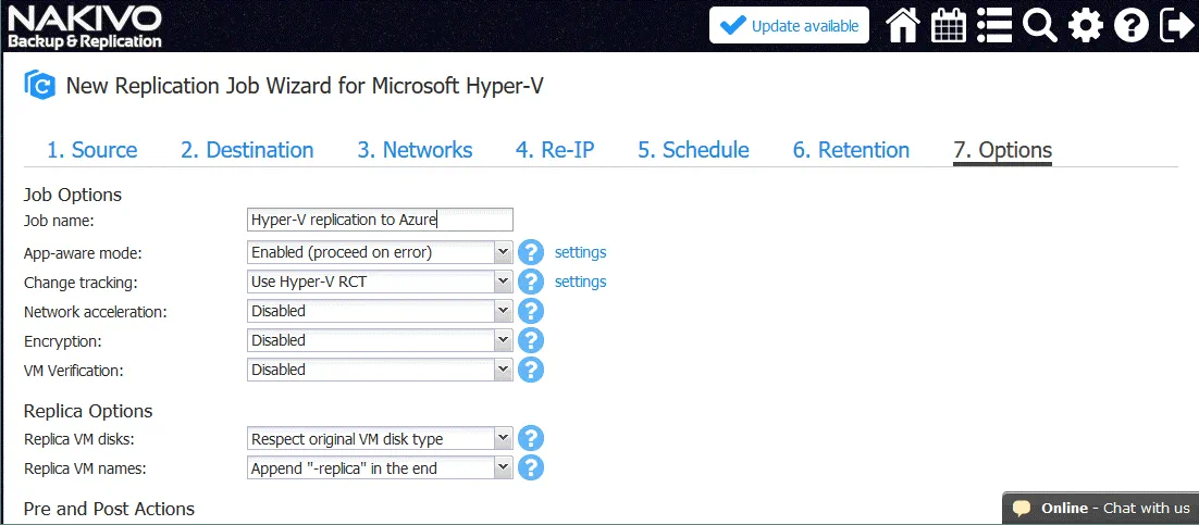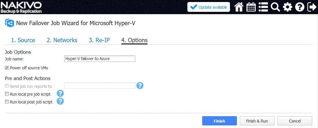 4. Options. Enter the job name (for example, Hyper-V failover to Azure).