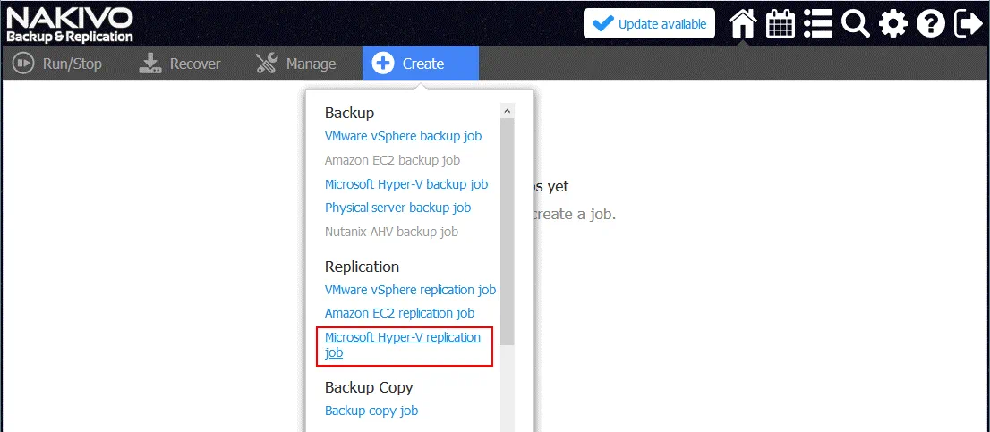 Go to the Home Page in the web interface of NAKIVO Backup & Replication. Click Create and select Microsoft Hyper-V replication job.