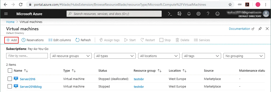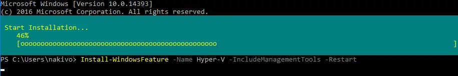 Once you have deployed a new Azure VM running Windows Server 2016, you can install the Hyper-V role. The VM you have created in Azure should start automatically after creation. You can also start the VM manually whenever you want. In order to start a VM in the Azure web interface, go to Home > Virtual machines, select the VM you have deployed (tick the checkbox) and click Start.