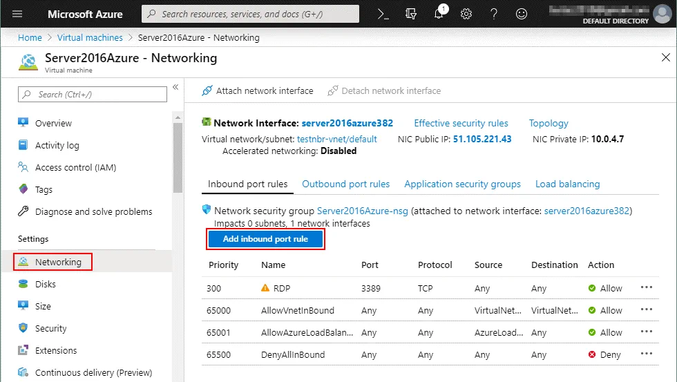 Select inbound ports: RDP (3389). This is the setting you saw on the first screen of the VM creation wizard.