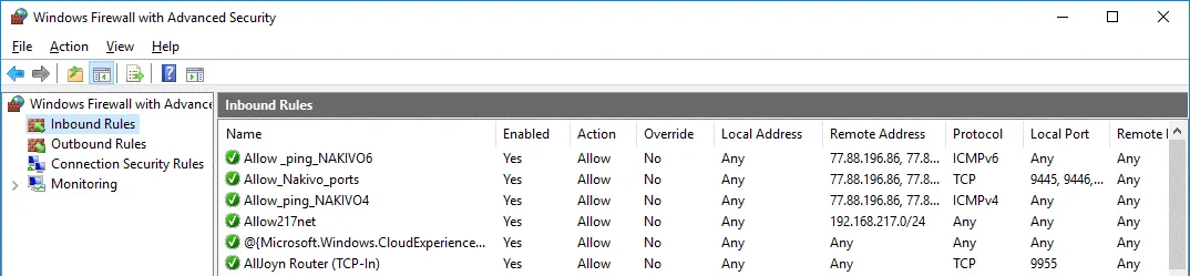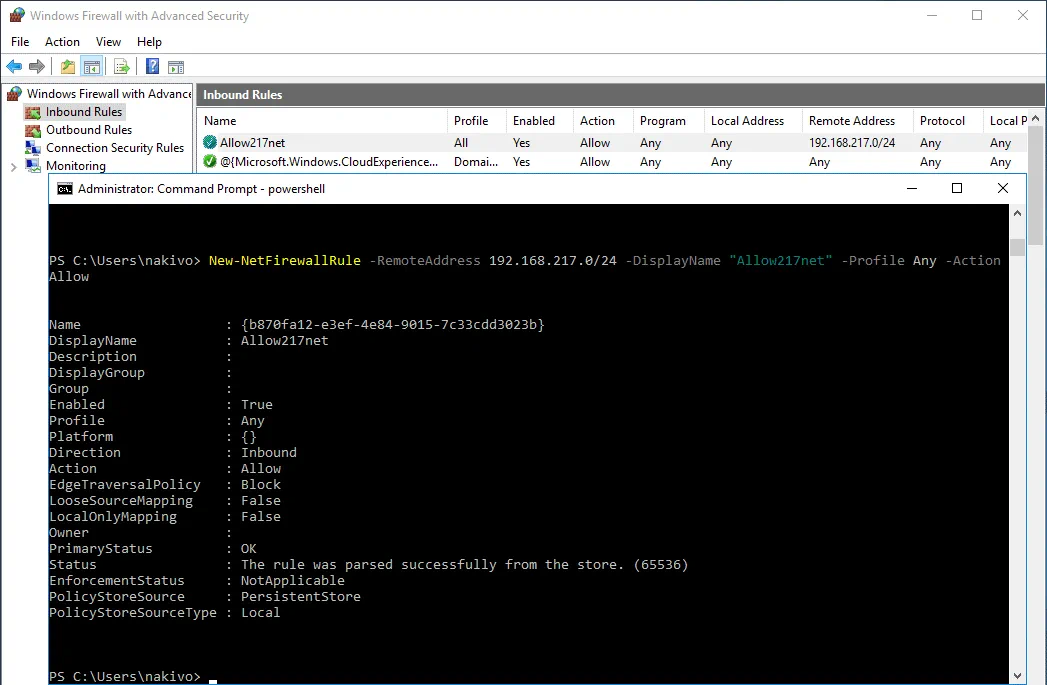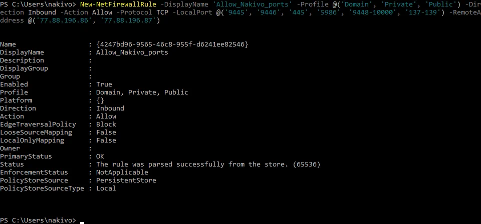 New-NetFirewallRule -DisplayName 'Allow_Nakivo_ports' -Profile @('Domain', 'Private', 'Public') -Direction Inbound -Action Allow -Protocol TCP -LocalPort @('9445', '9446', '445', '5986', '9448-10000', '137-139') -RemoteAddress @('77.88.196.86', '77.88.196.87')