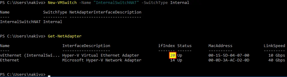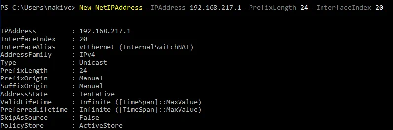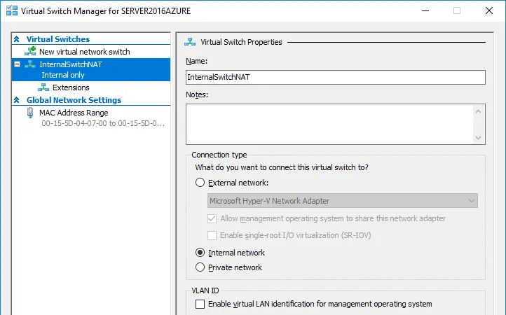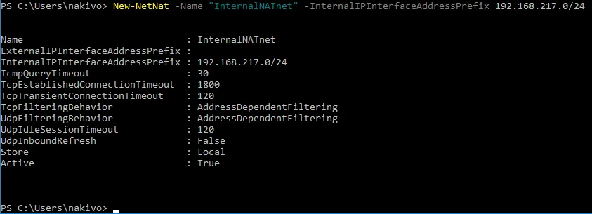 - A virtual switch on the Hyper-V host is configured for connecting nested VMs to the network behind the virtual NAT device. The name of this network is NAT Network and the name of the virtual switch is InternalSwitchNAT. The IP address of the virtual NAT device connected to this virtual switch is 192.168.217.1, and the network address is 192.168.217.0/24.