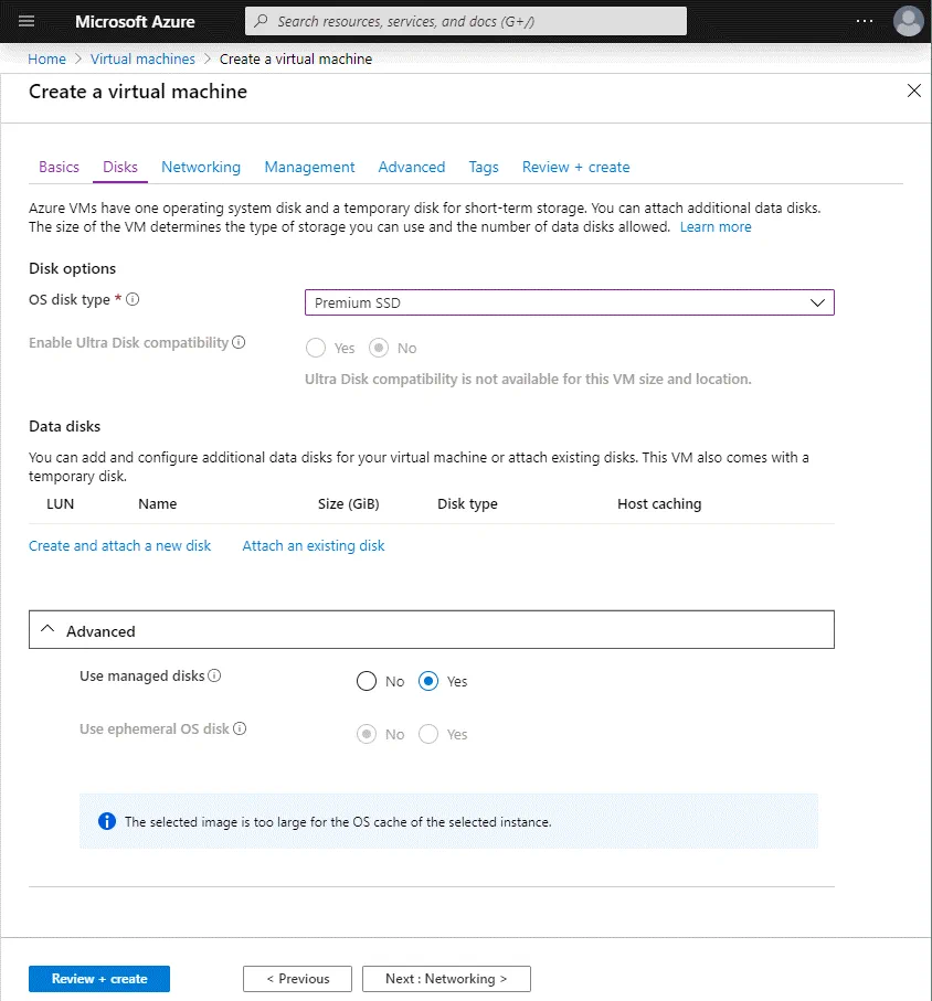 OS disk type: Premium SSD. The VM size selected previously supports premium SSD disks, and you can leave this option as it is most practical. Other available options are Standard HDD and Standard SSD.