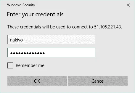 Username: nakivo (enter the user name you have set when deploying the virtual machine running Windows Server 2016 and Hyper-V in Azure)