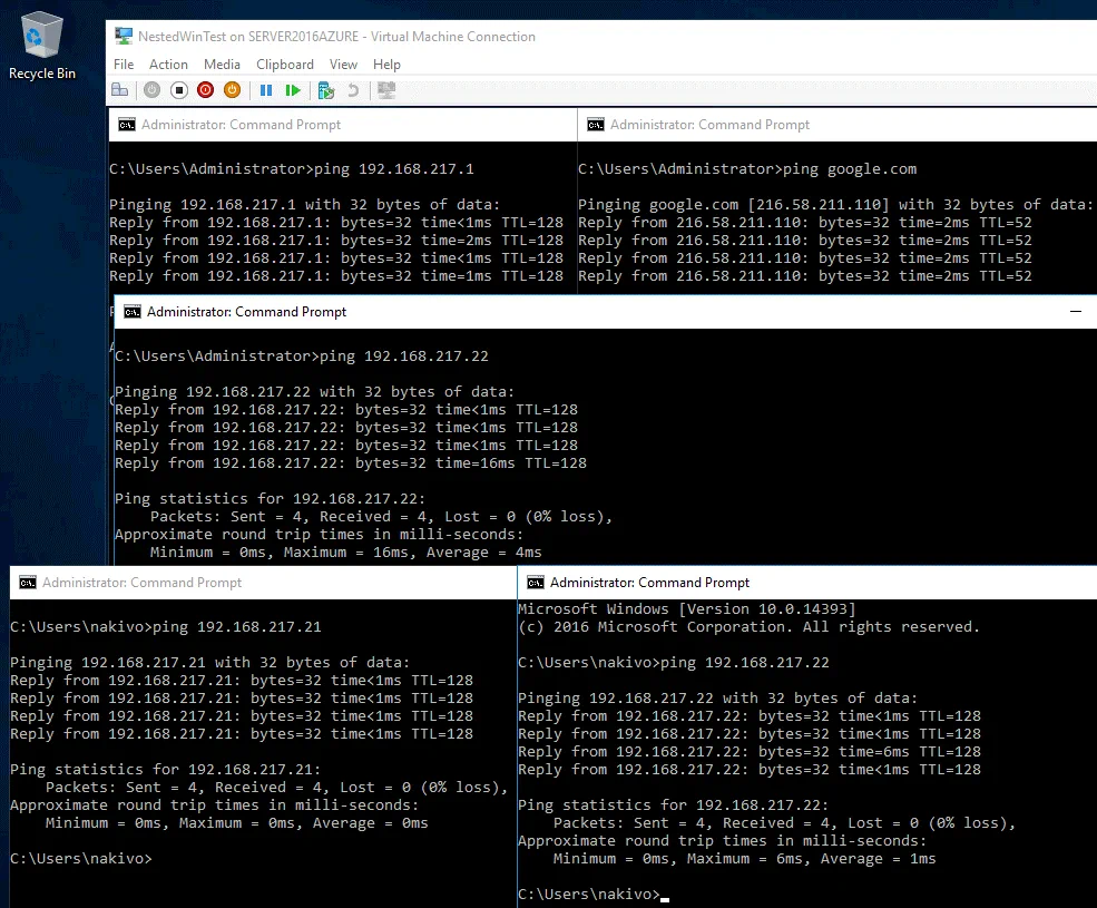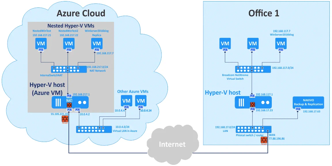 - Nested VMs are connected to the NAT network (192.168.217.0/24) and can access the internet. Two test VMs are created on the Hyper-V host in Azure and then a replica of the WinServer2016blog VM running on the Hyper-V host in the Office 1 is created on the Hyper-V host running in Azure Cloud.