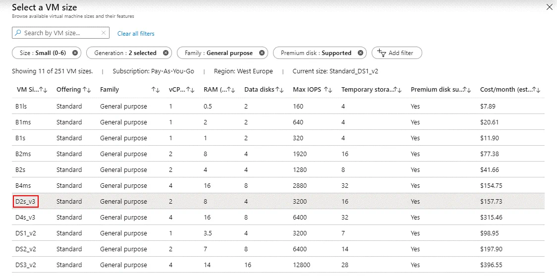 When you select a VM size, you can see the name of the VM, the number of virtual processors (vCPUs), the amount of memory (RAM), maximum IOPS value (input/output operations per second), the size of temporary storage, premium disk support and cost per month.