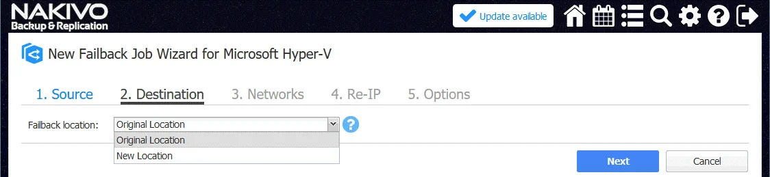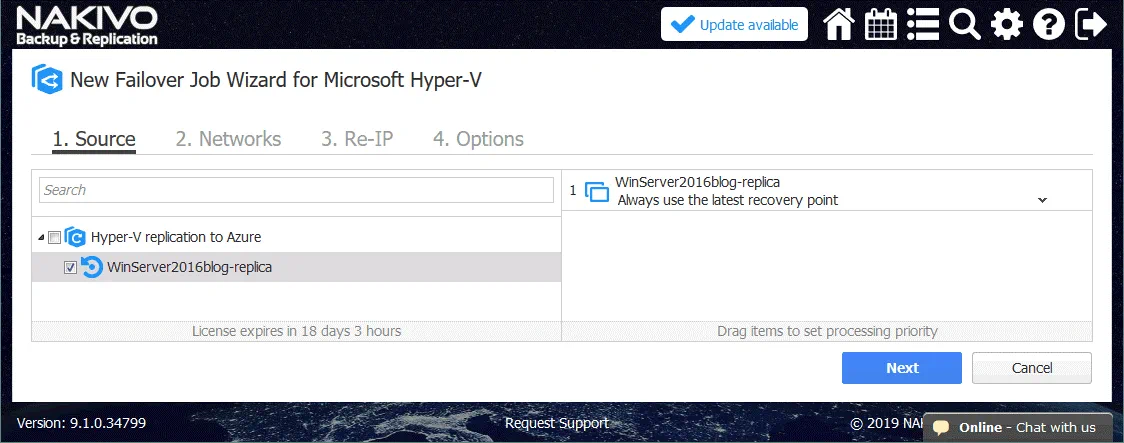 1. Source. Select the VM replica that was used for VM failover (WinServer2016blog-replica in our example). It is recommended that you shut down the VM replica before starting the failback job.