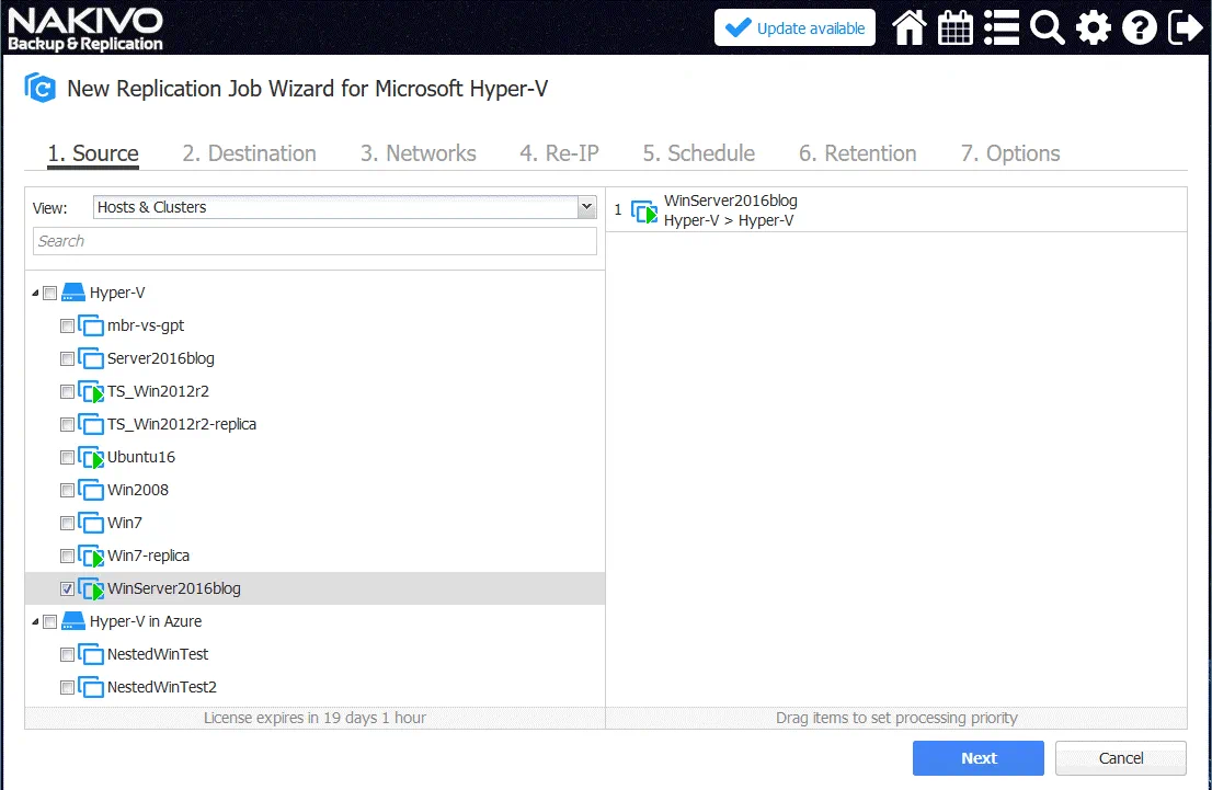 1. Source. Select the virtual machine that you want to replicate. In this example, WinServer2016blog is the name of the VM that will be replicated to Azure. You can see two nested VMs on the Hyper-V host in Azure that were created for testing.