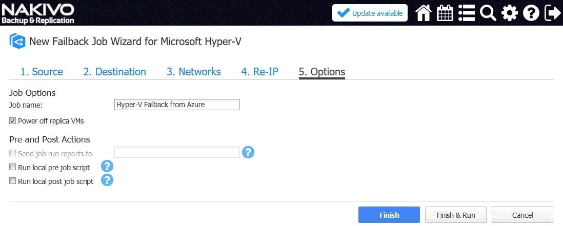 5. Options. Define failback job options such as VM name, pre and post actions.