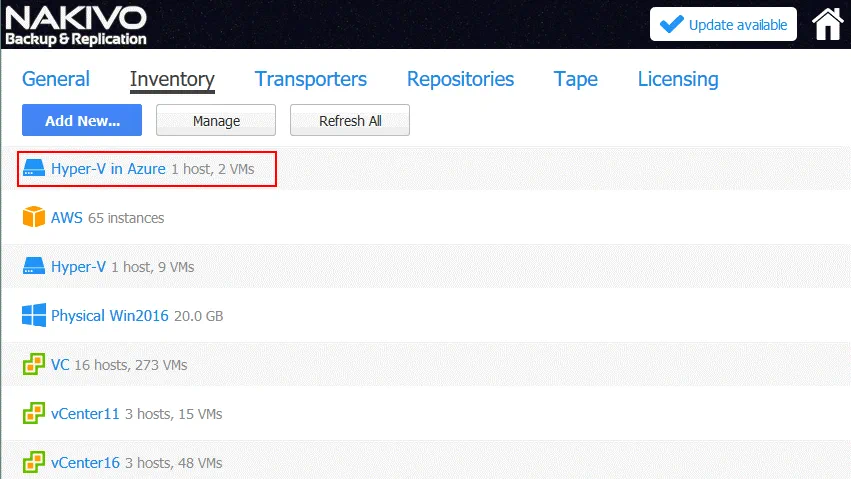 Your Hyper-V host running in your physical environment should be added to the Inventory before adding a remote Hyper-V host running in Azure Cloud. In this example, the local Hyper-V host is already added to the Inventory. Let’s now add a remote Hyper-V host deployed in Azure to the Inventory.