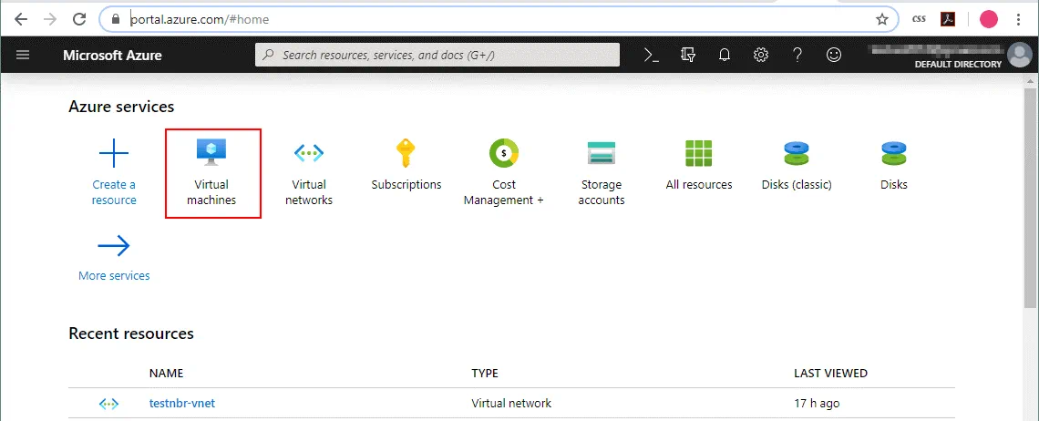 Create a VM running Windows Server 2016 in Azure. This VM will be used to install the Hyper-V server and run nested Hyper-V VMs. Open your web browser and go to the Microsoft Azure web site. Sign into Microsoft Azure by using your account. You should have the appropriate subscription to use Azure Cloud services. On the https://portal.azure.com/ page, select Virtual machines in the web interface.