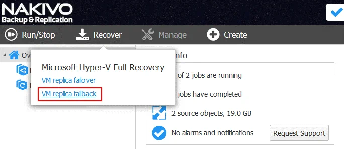 In order to perform failback, on the home page of the NAKIVO Backup & Replication web interface, go to Recover > VM replica failback.