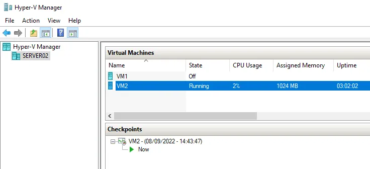 In your Hyper-V Manager of the source server (Server02 in our case), you can see a temporary Microsoft Hyper-V checkpoint of the source virtual machine that is being replicated.