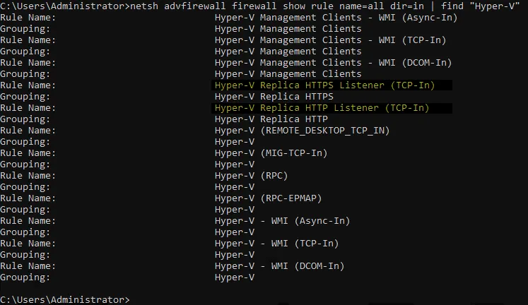 netsh advfirewall firewall show rule name=all dir=in | find "Hyper-V"