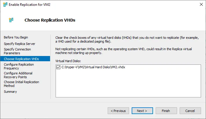 - Choose Replication VHDs. Select the virtual disks of the VM to replicate. The VM used in our example has one virtual disk.