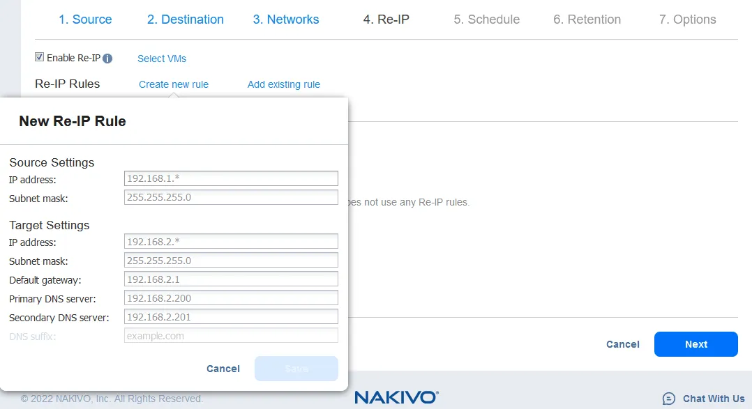 - Re-IP. You can set the custom IP address and other IP settings for the VM replica. Primary and secondary Hyper-V hosts can use different networks with different IP addresses, gateways, and DNS servers. You don’t have to edit VM settings for connecting a VM replica to the needed network manually in this case.