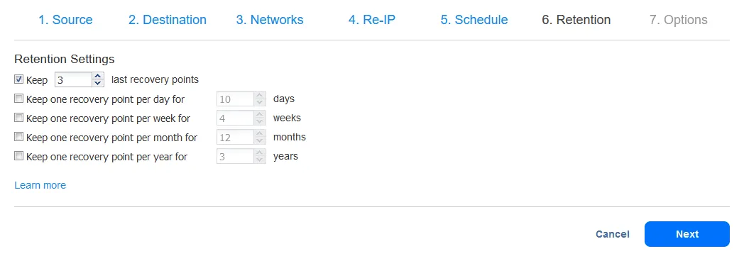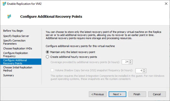 - Configure additional recovery points. Select the number of recovery points to retain for a VM replica. There are two options: