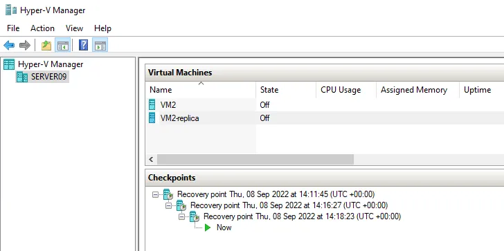 Let’s open Hyper-V Manager on the replica server (Server09). We can see that a VM replica has already been created. The name of this VM is VM2, as on the source Hyper-V host.