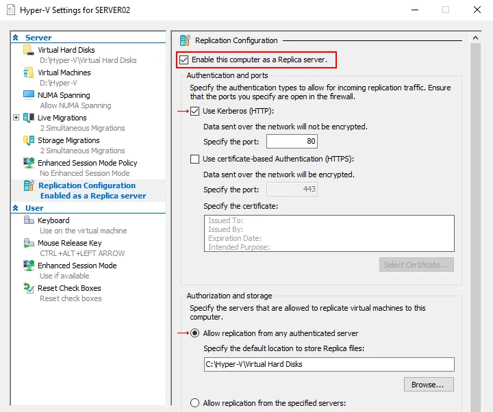 - In the left pane of the Hyper-V Settings window, click Replication Configuration. In the right panel of the window, select the following settings: