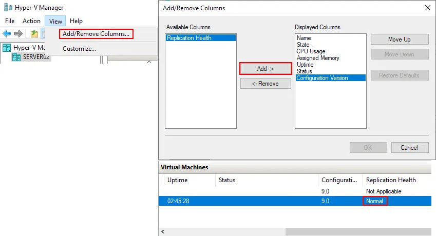 - Go to View > Add/Remove Columns in the main Hyper-V Manager window.
