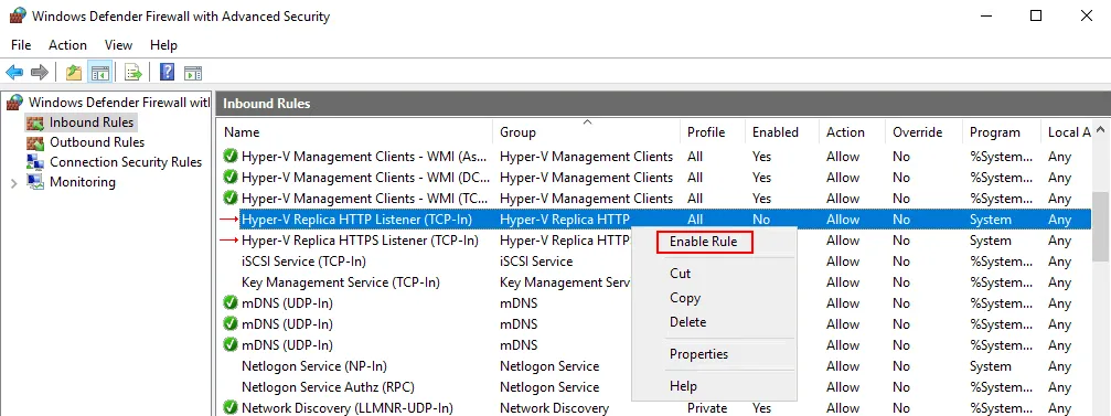 - Hyper-V Replica HTTP Listener (TCP-In) for HTTP traffic (port 80 for inbound connections)
