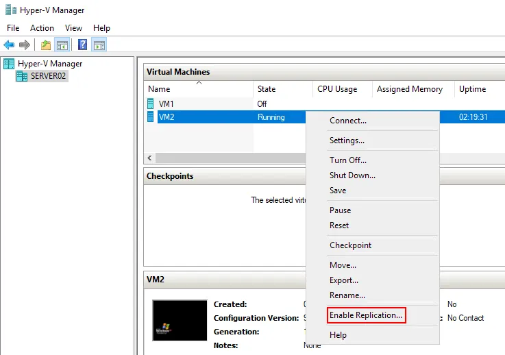Right-click the VM in Hyper-V Manager on the primary server (Server02 and VM2 in our case), and in the context menu, click Enable Replication.