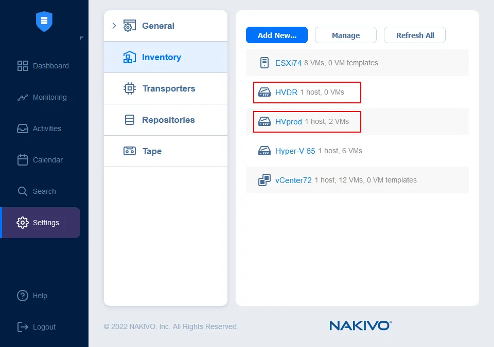 To perform Hyper-V replication, you first need to configure your Hyper-V hosts – both the production and disaster recovery (DR) environments. You have to add the hosts to the NAKIVO solution inventory and make sure firewall settings do not block connections, among other things. In the example below, we are replicating Hyper-V virtual machines from a production environment (HVProd) to a designated DR site (HVDR). It is worth noting that, as shown below, you can manage multiple hypervisors from the Inventory tab in the +NAKIVO Backup & Replication web interface.
