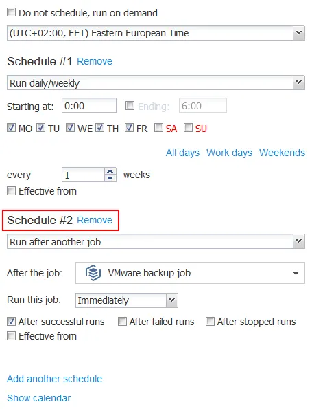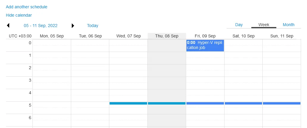 - Schedule. Set up the schedule based on which you want to perform replication of your Hyper-V virtual machine. Note the Add another schedule and Show calendar options.