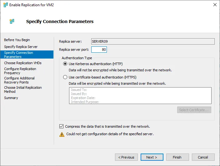 - Specify Connection parameters. The replica server has already been selected (Server09). Set the following parameters, which must match the ones you set previously in Hyper-V settings on both servers.