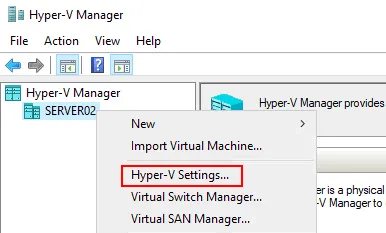 - Right-click the server name in Hyper-V Manager, and in the context menu, hit Hyper-V settings.