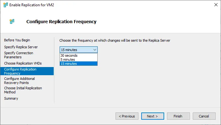 - Configure Replication Frequency. Select one of the three available options depending on your RPO and other factors such as network bandwidth and storage performance: