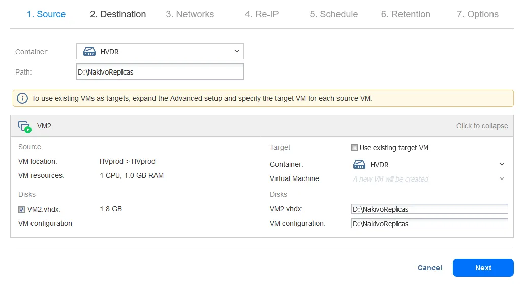 - Destination. Identify the target Hyper-V environment, including the destination path. The path selected in the example below (D:\NakivoReplicas) is the one we set in our Hyper-V settings to store our virtual machine replicas and configuration files.