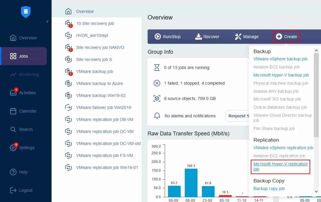 On the Jobs dashboard page, click Create > Replication > Microsoft Hyper-V replication job.