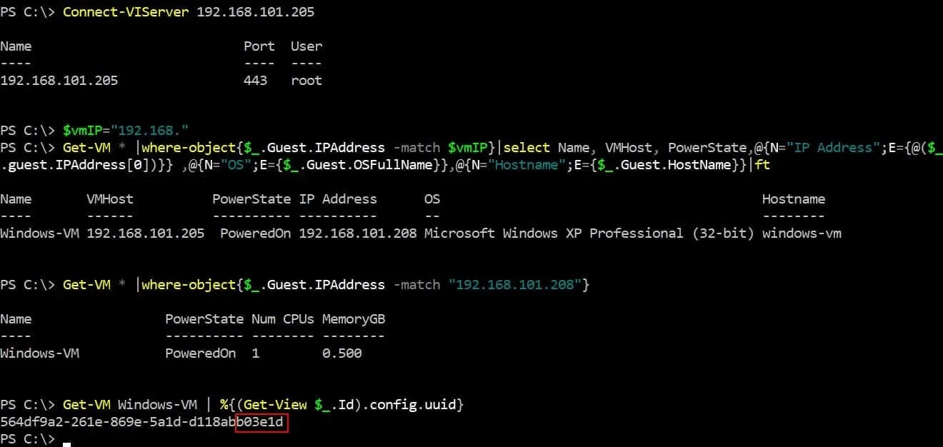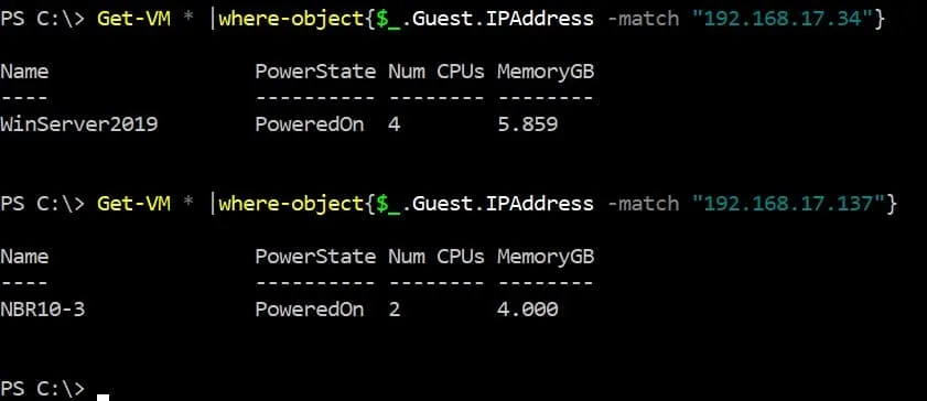 There is another method to identify a VM name if you know the IP address of a VM in PowerCLI. In this case, you should run two commands.