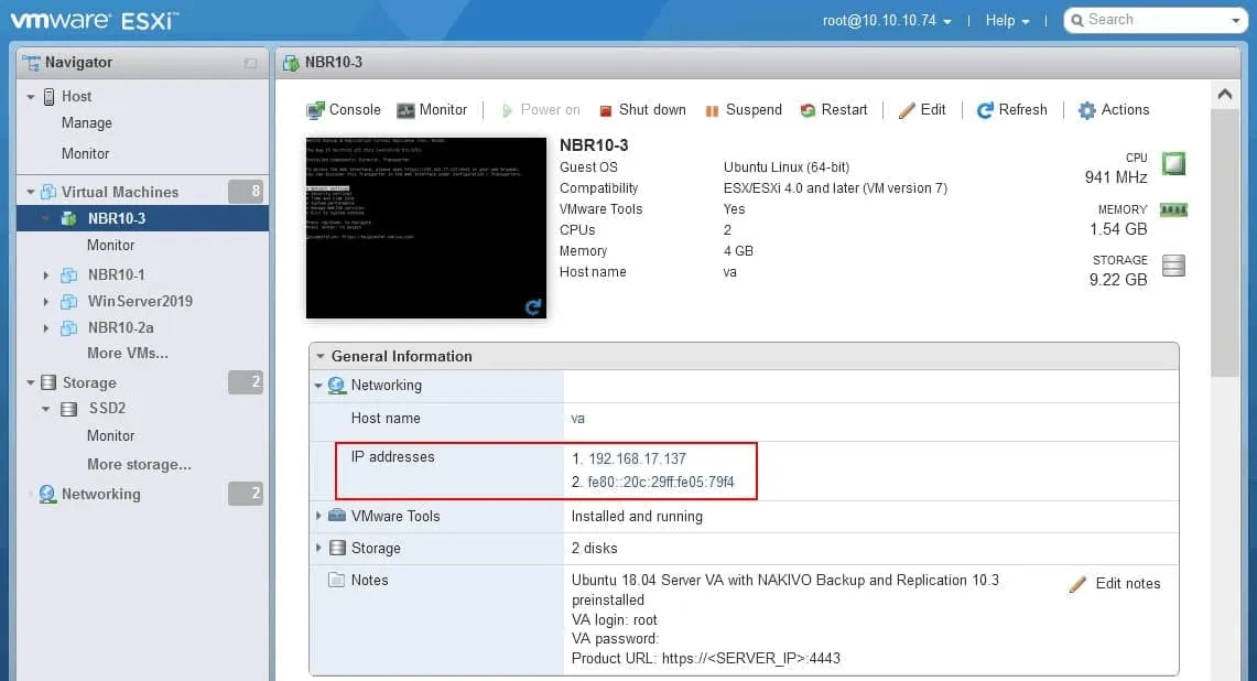 - In the screenshot below, you can see one IPv4 and one IPv6 address used by a VMware VM. VMware Tools must be installed on a guest operating system (OS) to view IP addresses in the web interface of VMware vSphere Client. The VM must be powered on.