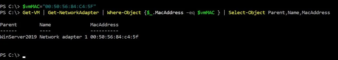 Get-VM | Get-NetworkAdapter | Where-Object {$_.MacAddress -eq $vmMAC } | Select-Object Parent,Name,MacAddress - You can connect to the ESXi host via SSH and use the ESXi command line interface) to identify a VM name by its virtual machine MAC address.