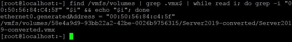find /vmfs/volumes | grep .vmx$ | while read i; do grep -i "00:50:56:84:C4:5F" "$i" && echo "$i"; done
