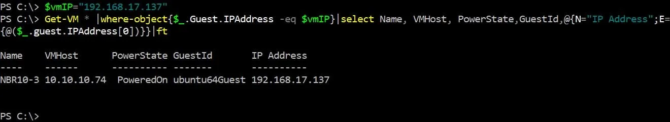 Get-VM * |where-object{$_.Guest.IPAddress -eq $vmIP}|select Name, VMHost, PowerState,GuestId,@{N="IP Address";E={@($_.guest.IPAddress[0])}}|ft