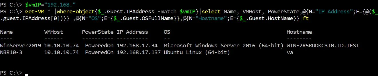 Get-VM * |where-object{$_.Guest.IPAddress -match $vmIP}|select Name, VMHost, PowerState,@{N="IP Address";E={@($_.guest.IPAddress[0])}} ,@{N="OS";E={$_.Guest.OSFullName}},@{N="Hostname";E={$_.Guest.HostName}}|ft - Here is a command to get a list of all VMs on a host or cluster and show IP addresses where it is possible: