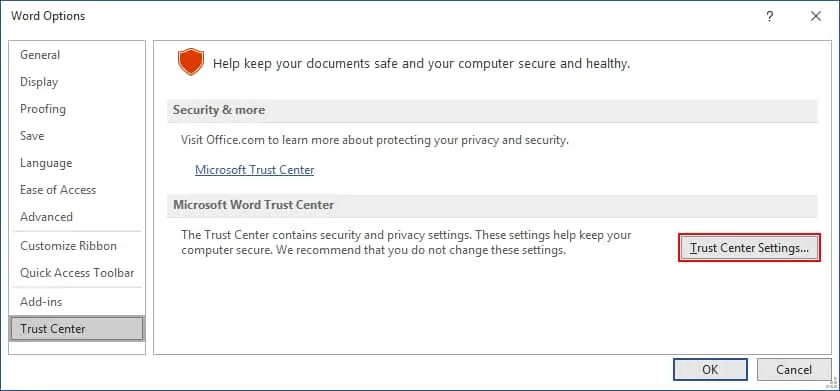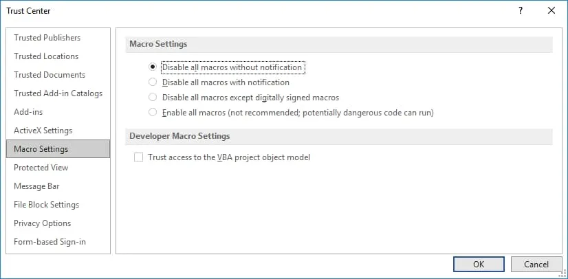 - Select Macro Settings in the navigation pane of the Trust Center window.